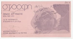 Έκθεση “Λαχειοφόρος έκθεσις της ερανικής επιτροπής δια την ενίσχυσιν των οικογενειών των κρατούμενων Κυπρίων” Τώνης Π. Σπητέρης (1910 - 1986) ; Βάσω Κατράκη (1914 - 1988) ; Σπύρος Βασιλείου (1902 - 1985) ; Ορέστης Κανέλλης (1910 - 1979) ; Τάσσος Α. (1914 - 1985) ; Νικόλαος Χατζηκυριάκος-Γκίκας (1906 - 1994) ; Γιάννης Μόραλης (1916 - 2009) ; Γεώργιος Γουναρόπουλος (1889 - 1977) ; Σπύρος Παπαλουκάς (1892 - 1957) ; Γιάννης Μηταράκης (1898 - 1963) ; Αγήνωρ Αστεριάδης (1898 - 1977) ; Γιώργος Σικελιώτης (1917 - 1984) ; Γιάννης Σπυρόπουλος (1912 - 1990) ; Γιάννης Τσαρούχης (1910 - 1989) ; Δημήτρης Γιαννουκάκης (1898 - 1991) ; Χρήστος Καπράλος (1909 - 1993) ; Λίλη Αρλιώτη (1908 - 1979) ; Φρόσω Ευθυμιάδη-Μενεγάκη ; Αλέκος Κοντόπουλος (1904 - 1975) ; Γιώργος Μπουζιάνης (1885 - 1959) ; Γιάννης Κεφαλληνός (1894 - 1957) ; Περικλής Βυζάντιος (1893 - 1972) ; Δημήτρης Γιολδάσης (1897 - 1993) ; Κωνσταντίνος Γραμματόπουλος (1916 - 2003) ; Χρίστος Δαγκλής (1916 - 1991) ; Άγγελος Θεοδωρόπουλος (1883 - 1965) ; Γεώργιος Κοσμαδόπουλος (1895 - 1967) ; Κλέαρχος Λουκόπουλος (1906 - 1995) ; Αγλαϊα Παπά (1904 - 1984)