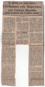 «Εκθέσεις ζωγραφικής. Μία ωραία πρωτοβουλία υπέρ των οικογενειών των Κυπρίων κρατουμένων» Τώνης Π. Σπητέρης (1910 - 1986) ; Βάσω Κατράκη (1914 - 1988) ; Σπύρος Βασιλείου (1902 - 1985) ; Ορέστης Κανέλλης (1910 - 1979) ; Τάσσος Α. (1914 - 1985) ; Νικόλαος Χατζηκυριάκος-Γκίκας (1906 - 1994) ; Γιάννης Μόραλης (1916 - 2009) ; Γεώργιος Γουναρόπουλος (1889 - 1977) ; Σπύρος Παπαλουκάς (1892 - 1957) ; Γιάννης Μηταράκης (1898 - 1963) ; Αγήνωρ Αστεριάδης (1898 - 1977) ; Γιώργος Σικελιώτης (1917 - 1984) ; Γιάννης Σπυρόπουλος (1912 - 1990) ; Γιάννης Τσαρούχης (1910 - 1989) ; Δημήτρης Γιαννουκάκης (1898 - 1991) ; Χρήστος Καπράλος (1909 - 1993) ; Λίλη Αρλιώτη (1908 - 1979) ; Φρόσω Ευθυμιάδη-Μενεγάκη ; Αλέκος Κοντόπουλος (1904 - 1975) ; Ευθύμιος Παπαδημητρίου (1895 - 1958) ; Γιώργος Μπουζιάνης (1885 - 1959) ; Γιάννης Κεφαλληνός (1894 - 1957) ; Περικλής Βυζάντιος (1893 - 1972) ; Δημήτρης Γιολδάσης (1897 - 1993) ; Κωνσταντίνος Γραμματόπουλος (1916 - 2003) ; Χρίστος Δαγκλής (1916 - 1991) ; Άγγελος Θεοδωρόπουλος (1883 - 1965) ; Γεώργιος Κοσμαδόπουλος (1895 - 1967) ; Κλέαρχος Λουκόπουλος (1906 - 1995) ; Αγλαϊα Παπά (1904 - 1984) ; Φώτης Φωτιάδης
