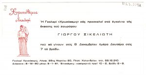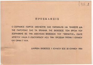 Έκθεση “Λαχειοφόρος έκθεσις της ερανικής επιτροπής δια την ενίσχυσιν των οικογενειών των κρατούμενων Κυπρίων” Τώνης Π. Σπητέρης (1910 - 1986) ; Βάσω Κατράκη (1914 - 1988) ; Σπύρος Βασιλείου (1902 - 1985) ; Ορέστης Κανέλλης (1910 - 1979) ; Τάσσος Α. (1914 - 1985) ; Νικόλαος Χατζηκυριάκος-Γκίκας (1906 - 1994) ; Γιάννης Μόραλης (1916 - 2009) ; Γεώργιος Γουναρόπουλος (1889 - 1977) ; Σπύρος Παπαλουκάς (1892 - 1957) ; Γιάννης Μηταράκης (1898 - 1963) ; Αγήνωρ Αστεριάδης (1898 - 1977) ; Γιώργος Σικελιώτης (1917 - 1984) ; Γιάννης Σπυρόπουλος (1912 - 1990) ; Γιάννης Τσαρούχης (1910 - 1989) ; Δημήτρης Γιαννουκάκης (1898 - 1991) ; Χρήστος Καπράλος (1909 - 1993) ; Λίλη Αρλιώτη (1908 - 1979) ; Φρόσω Ευθυμιάδη-Μενεγάκη ; Αλέκος Κοντόπουλος (1904 - 1975) ; Γιώργος Μπουζιάνης (1885 - 1959) ; Γιάννης Κεφαλληνός (1894 - 1957) ; Περικλής Βυζάντιος (1893 - 1972) ; Δημήτρης Γιολδάσης (1897 - 1993) ; Κωνσταντίνος Γραμματόπουλος (1916 - 2003) ; Χρίστος Δαγκλής (1916 - 1991) ; Άγγελος Θεοδωρόπουλος (1883 - 1965) ; Γεώργιος Κοσμαδόπουλος (1895 - 1967) ; Κλέαρχος Λουκόπουλος (1906 - 1995) ; Αγλαϊα Παπά (1904 - 1984)