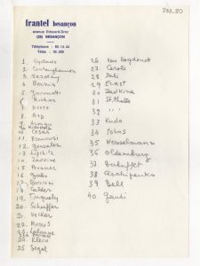 Κατάλογος των συμμετεχόντων στην έκθεση “Artistes grecs à Paris” Ιωάννα Σπητέρη-Βεροπούλου (1920 - 2000) ; Μάρκος Βαφειάδης (1906 - 1992) ; Μπέλλα Ραφτοπούλου (1902 - 1992) ; Παύλος (Διονυσόπουλος) (1930 - 2019) ; Τζον Χριστοφόρου (1921 - 2014) ; Αλέκος Φασιανός (1935 - 2022) ; Μανώλης Καλλιγιάννης ; Γαβριέλλα Σίμωσι (1926 - 1999) ; Γιάννης Τσαρούχης (1910 - 1989) ; Κώστας Τσόκλης (1930) ; Δανιήλ (1924 - 2008) ; Κώστας Κουλεντιανός (1918 - 1995) ; Ντίκος Βυζάντιος (1924 - 2007) ; Ρένα Τζολάκη (1930) ; Αριστομένης Αγγελόπουλος (1900 - 1990) ; Φιλόλαος (1923 - 2010) ; Γιάννης Φωκάς (1951) ; Κώστας Χαραλαμπίδης (1946) ; Άλκης Πιερράκος (1920 - 2017) ; Βασίλης Σπεράντζας (1938) ; Σαράντης Καραβούζης (1938 - 2011) ; Γιουλίκα Λακερίδου (1940) ; Άννα Κινδύνη-Μαρουδή ; Τίτα Κριεζή (1930 - 2021) ; Αγλαΐα Λυμπεράκη (1923 - 1985) ; Κώστας Μακρής ; Γιάννης Μαλτέζος (1915 - 1987) ; Ιάσων Μολφέσης (1925 - 2009) ; Κωνσταντίνος Μόραλης ; Γιάννης Μπουτέας (1941) ; Κωνσταντίνος Ξενάκης (1931 - 2020) ; Ναυσικά Πάστρα (1921 - 2011) ; Gisele Πράσινου ; Βασιλική Τσεκούρα ; Πάνος Ελευθερίου ; Δημήτρης Ράτσικας ; Νίκος Δαμιανάκης (1920 - 2013) ; Μίλτος Παντελιάς (1954) ; Νίκος Τσιώτης ; Εριέττα Βορδώνη (1959) ; Κωνσταντίνος Γιαννικούρης